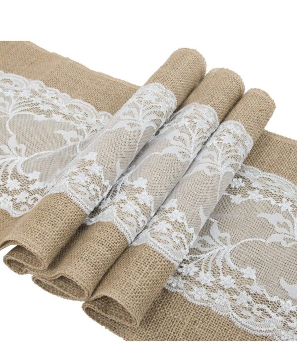 Idéal pour un thème Champêtre ou Bohème Chic , ce chemin de table en toile de jute et dentelle apportera une touche romantique et élégante à votre décoration de table .